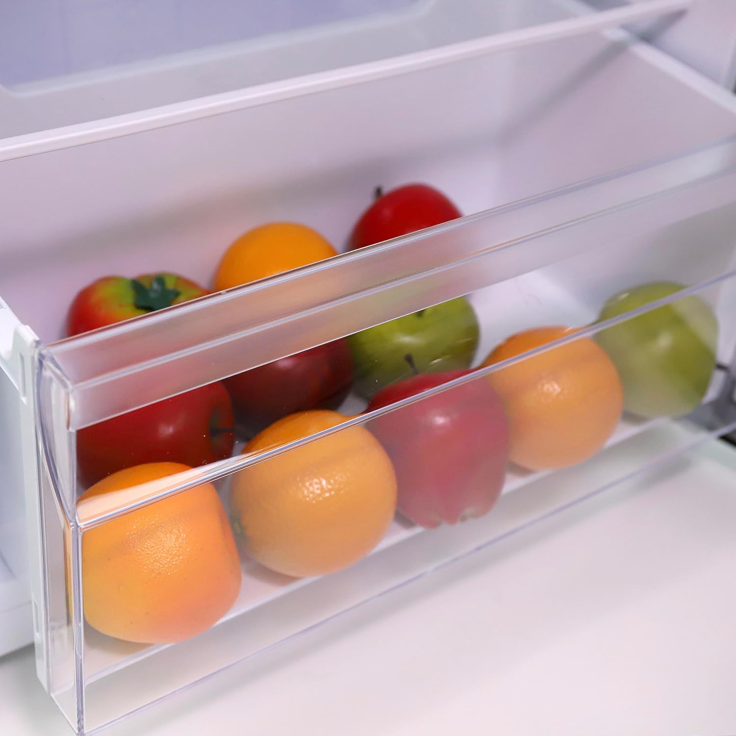 VERSATILE FEATURES: Reversible doors, Adjustable glass shelves, crisper drawer with glass cover, adjustable/removable door bins, interior LED light, ice cube tray